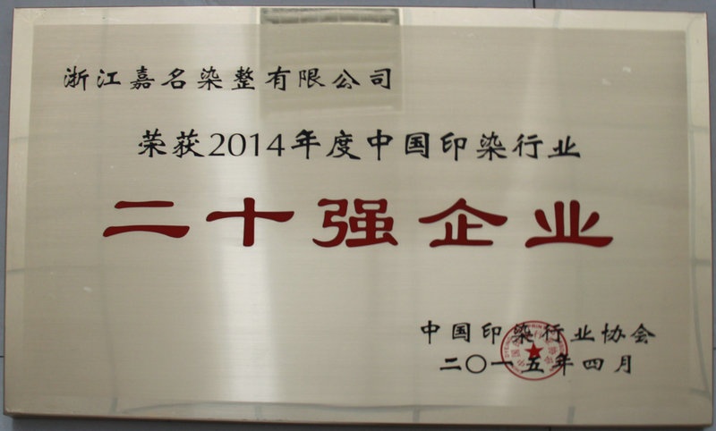 浙江嘉名染整有限公司獲“2014年度中國(guó)印染行業(yè)企業(yè)20強(qiáng)”